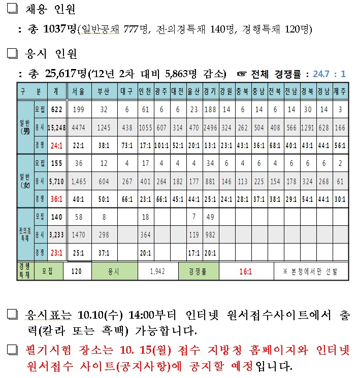 2012년 제3차 순경 채용시험 각 지방청별 경쟁률 공지