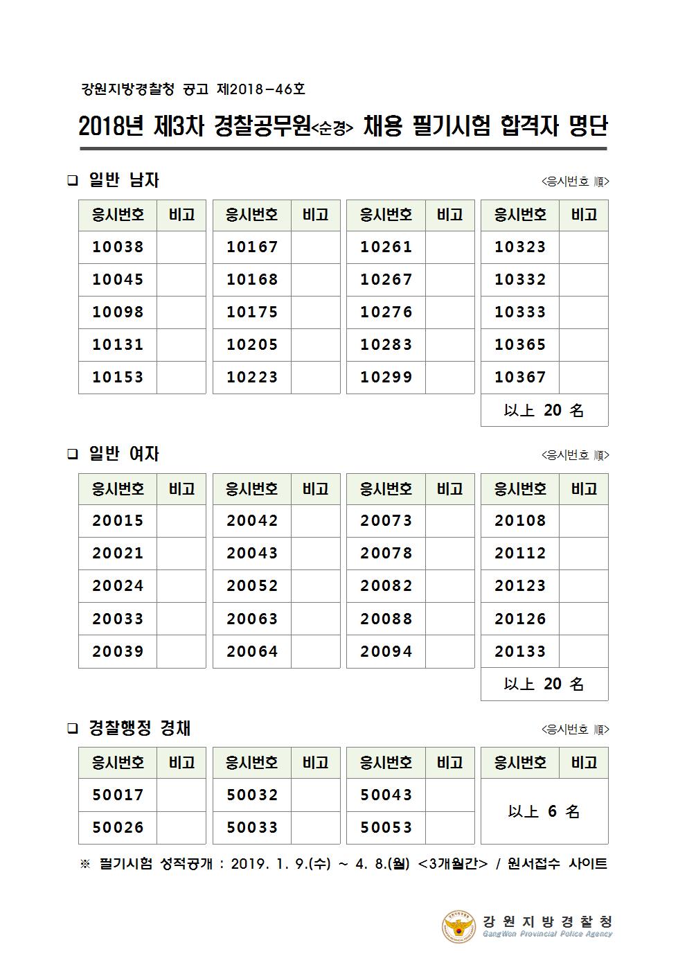 공지 [강원청] 2018년 3차 경찰공무원(순경) 시험 필기합격자명단 (12월22일시행)