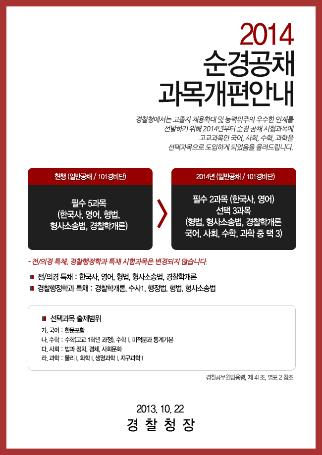 2014년 순경공채 과목개편안내 페이지 정보 작성자 중앙경찰학원 댓글 0건 조회 15,289회 작성일 13-10-23 16:15 목록 본문 . 이전글14년도 경찰관 채용시험 계획 공지 13.12.09 다음글2013년 유무선 레이더 전문요원 특별채용 공고 13.10.21 목록 글쓰기 수정 답변 삭제