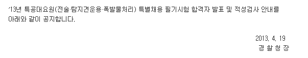 2013년도 경찰특공대요원(전술,탐지견운용,폭발물처리) 특별채용 필기합격자 및 적성검사 안내