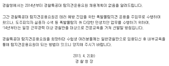 경찰특공대 탐지견운용요원 채용제도 폐지 안내 페이지 정보 작성자 중앙경찰학원 댓글 0건 조회 5,579회 작성일 13-04-08 17:03 목록 본문 대전중앙경찰학원 이전글2013년도 경찰공무원 특별채용[무선레이더운용] 시험계획 13.04.12 다음글2013년도 경찰특공대 특별전형 실기합격자 발표 및 필기시험 서류제출안내 13.03.28 목록 글쓰기 수정 답변 삭제