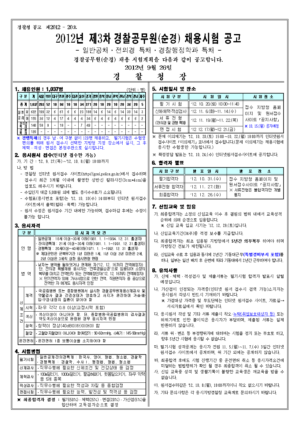 2012년 제3차 경찰공무원(순경)채용 시험을 덧붙임과 같이 공고합니다.