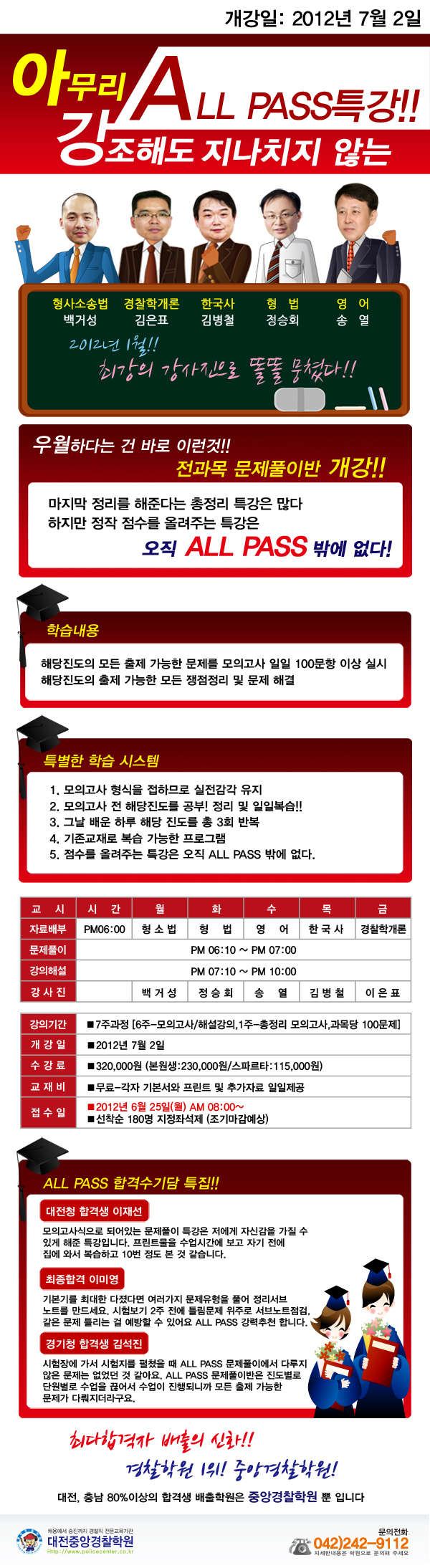 [7/2 개강] 2012년 2차 시험대비 All Pass 문제풀이 특강 페이지 정보 작성자 중앙경찰학원 댓글 0건 조회 6,831회 작성일 12-06-21 11:20 목록 본문 . 이전글2012년 제 2차 경찰공무원(순경) 채용시험 공고 12.07.23 다음글1_12년 특공대 실기 발표 및 필기시험 안내 12.04.03 목록 글쓰기 수정 답변 삭제