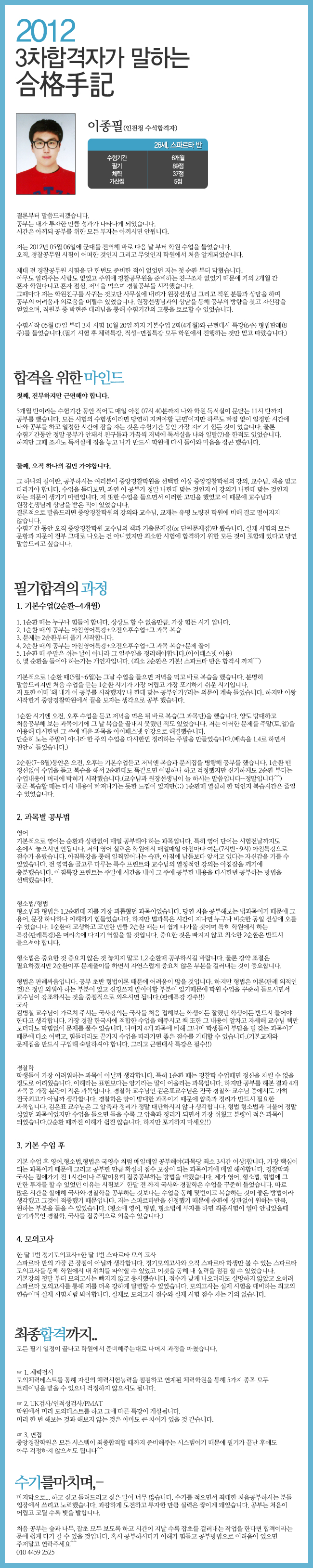 '12 3차 인천청 수석합격자의 최종합격수기(6개월만에 수석합격) 페이지 정보 작성자 이종필 댓글 0건 조회 10,601회 작성일 12-12-29 14:29 목록 답변 게시판 리스트 옵션 수정 삭제 본문 . 이전글2012 3차 합격수기(경기청)입니다. 13.01.21 다음글12년3차 대전청 합격 수기입니다 12.12.27 목록 글쓰기 수정 답변 삭제